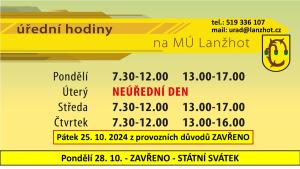 Pátek 25. 10. 2024 a v pondělí 28. 10. 2024 bude z provozních důvodů a z důvodu státního svátku na městském úřadě a v knihovně ZAVŘENO. V pondělí 28. 10. bude na sběrném dvoře ZAVŘENO. Více info na plakátu.