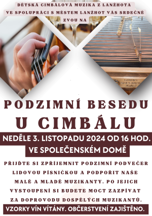 Dětská cimbálová muzika z Lanžhota ve spolupráci s městem Lanžhot Vás srdečně zvou na PODZIMNÍ BESEDU U CIMBÁLU v neděli 3. 11. 2024 v 16 hod. ve Společenském domě. Pro více informací rozklikněte.