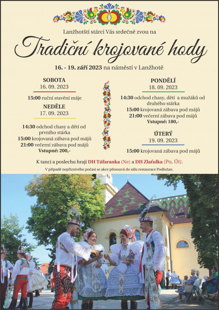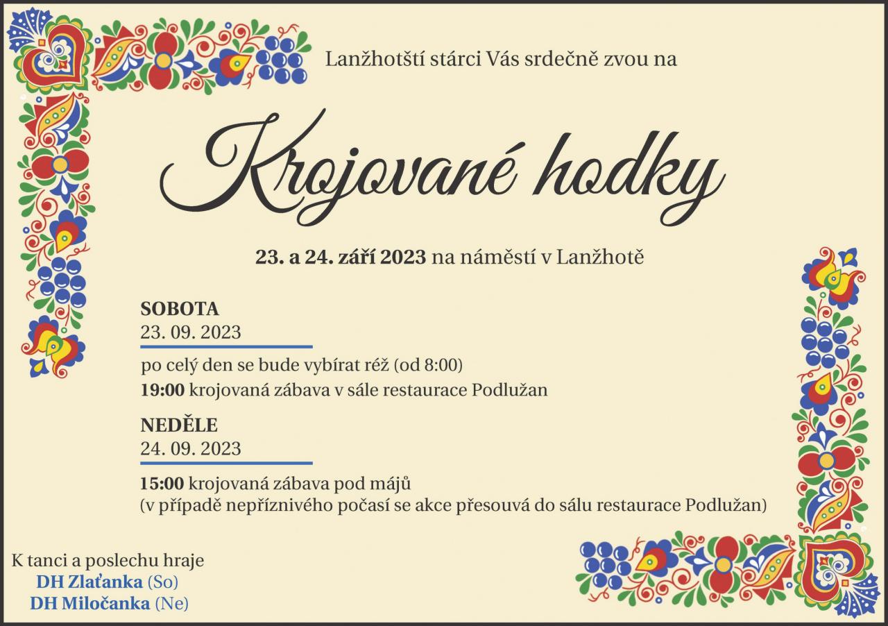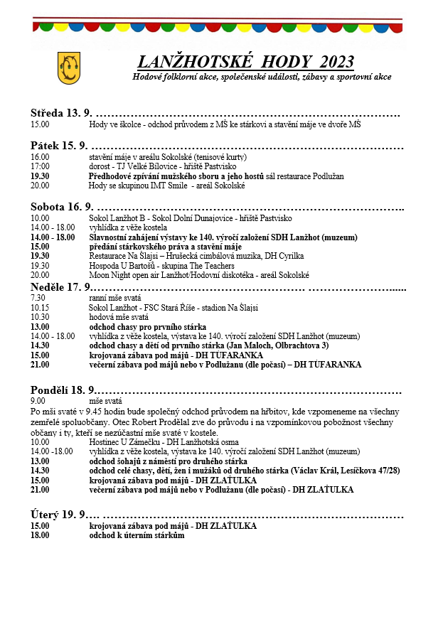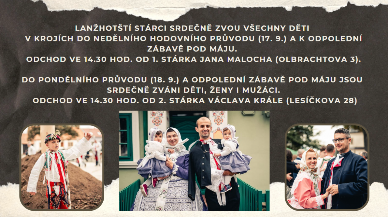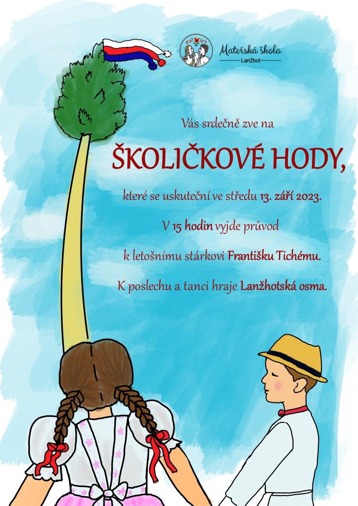 Mateřská škola Lanžhot Vás co nejsrdečněji zve na ŠKOLIČKOVÉ HODY. Za doprovodu dechové hudby v čele se stárkem bude odcházet celý průvod ke stárkovi Františku Tichému. Průvod vychází dvorem na ulici Komenského přes ulice Lipová, Luční na Ulici Mlýnská III a II. Odtud se pak celý průvod vrací zpět na dvůr MŠ, kde budou děti stavět svou hodovní máju a tančit v doprovodu dechové hudby Lanžhotská osma.