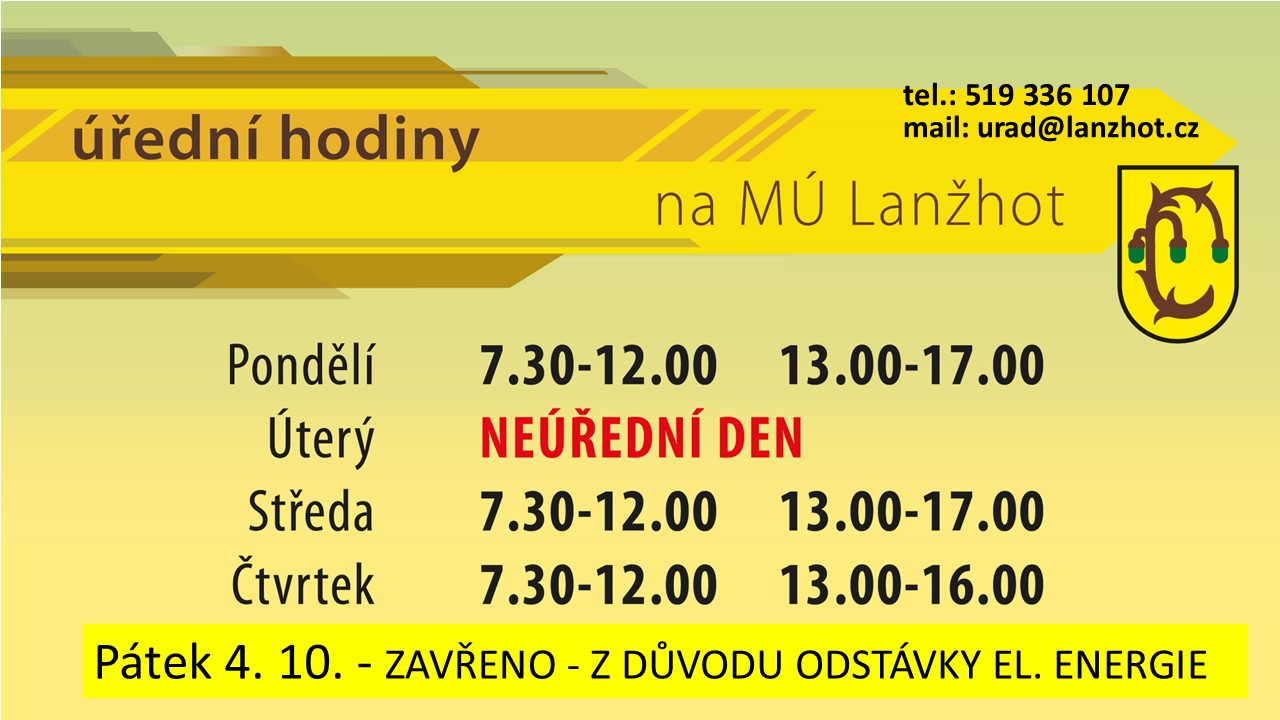 V pátek 4. 10. bude městský úřad a knihovna ZAVŘENA - Z DŮVODU ODSTÁVKY EL. ENERGIE.