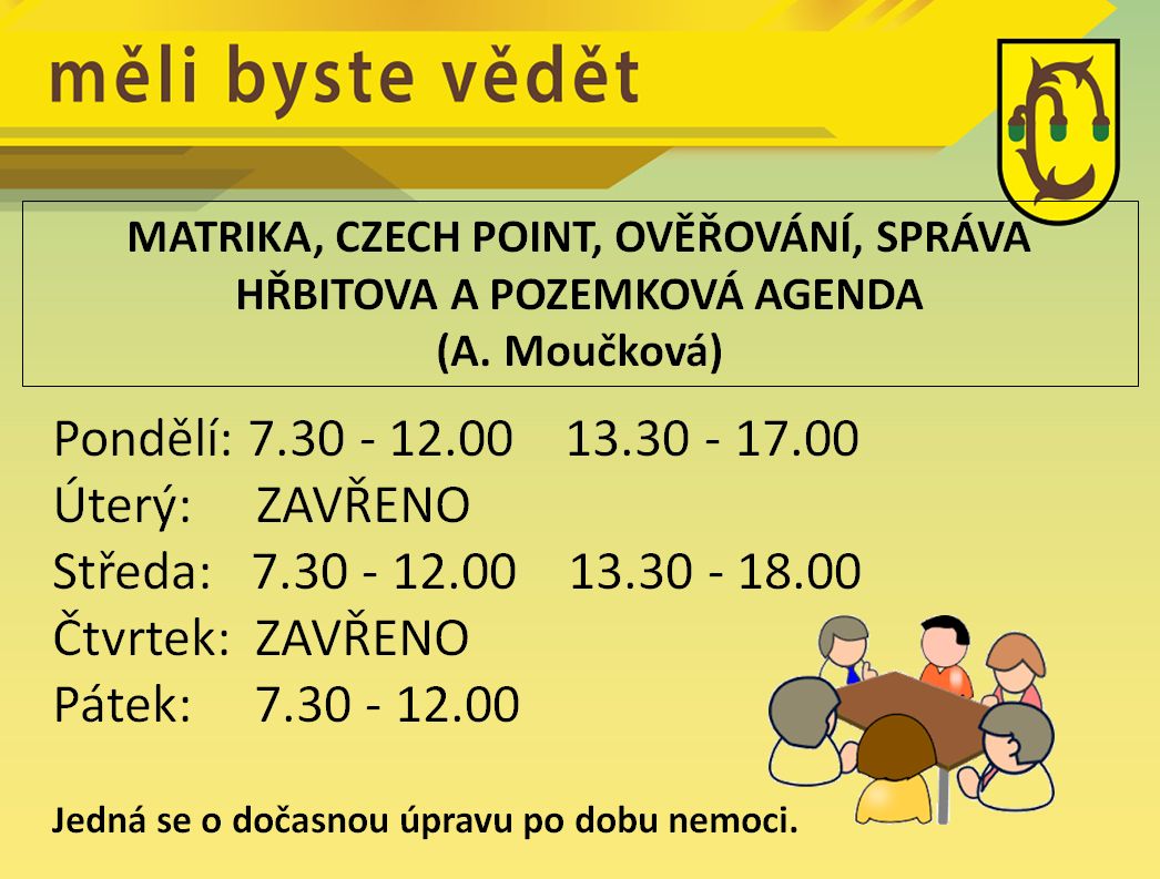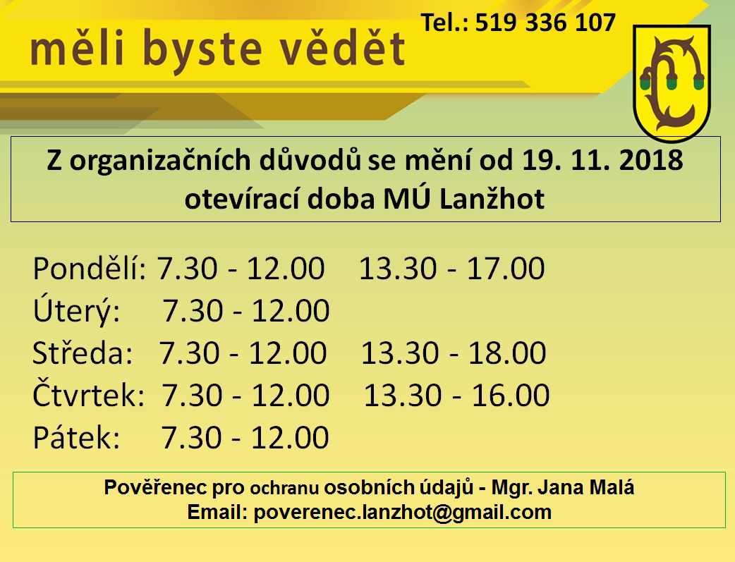 Z organizačních důvodů se mění od 19. 11. 2018 otevírací doba MÚ Lanžhot.
