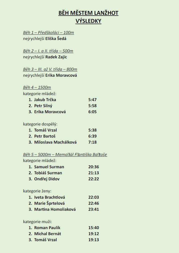 Šestý ročník sportovní akce BĚH MĚSTEM LANŽHOT se konal poprvé na fotbalovém hřišti Na Šlajsi. Závodníci i fanoušci se sešli v hojném počtu. Jejich elán, nadšení a výborné sportovní výkony pomohly navodit výbornou sportovní atmosféru.