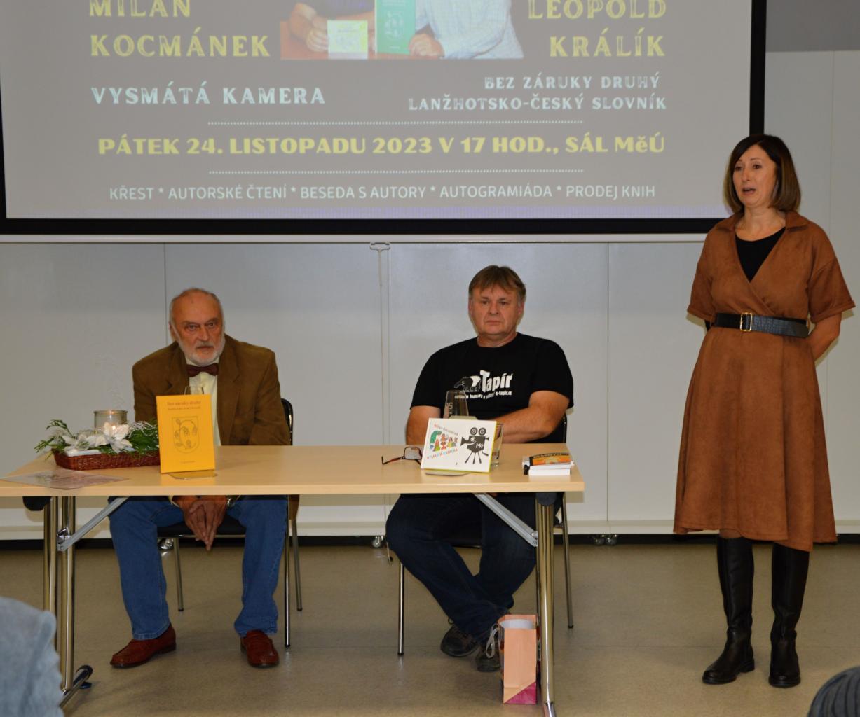 V pátek 24. listopadu proběl v sále městského úřadu DVOJITÝ KŘEST knih učitelů ze Základní školy Lanžhot Milana Kocmánka a Leopolda Králíka. Ve velmi příjemné atmosféře proběhl křest, autorské čtení, beseda s autory i autogramiáda s prodejem knih.