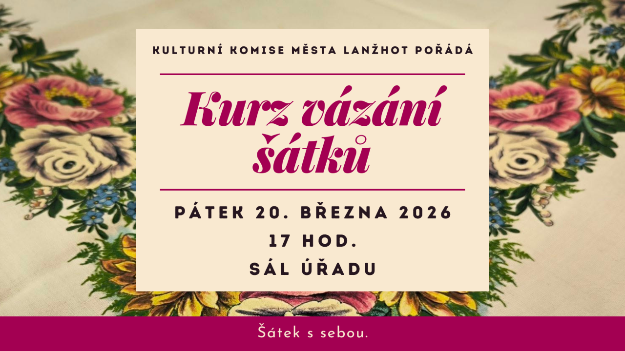 Kulturní komise MěÚ zve všechny zájemkyně na KURZ VÁZÁNÍ ŠÁTKŮ v pátek 20. 3. 2026 v 17 hod. v sále Městského úřadu Lanžhot.