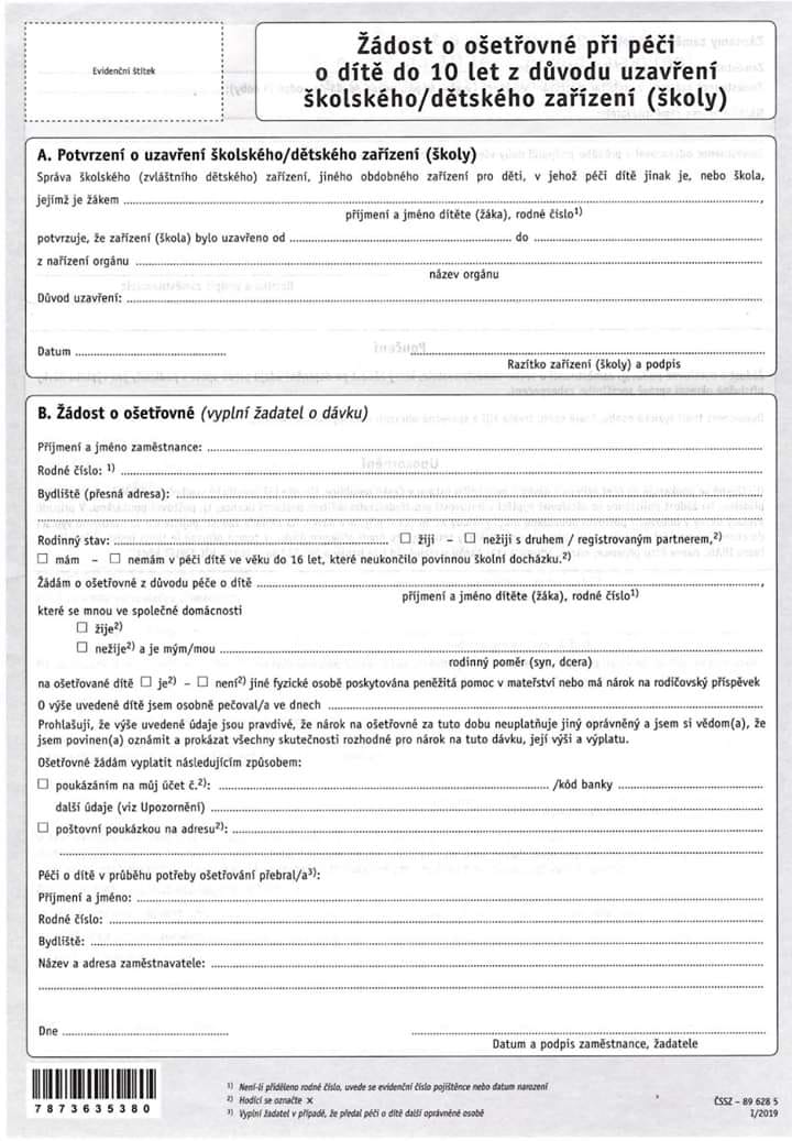 Žádost o ošetřovné při péči o dítě do 10 let z důvodu uzavření školy - Zde