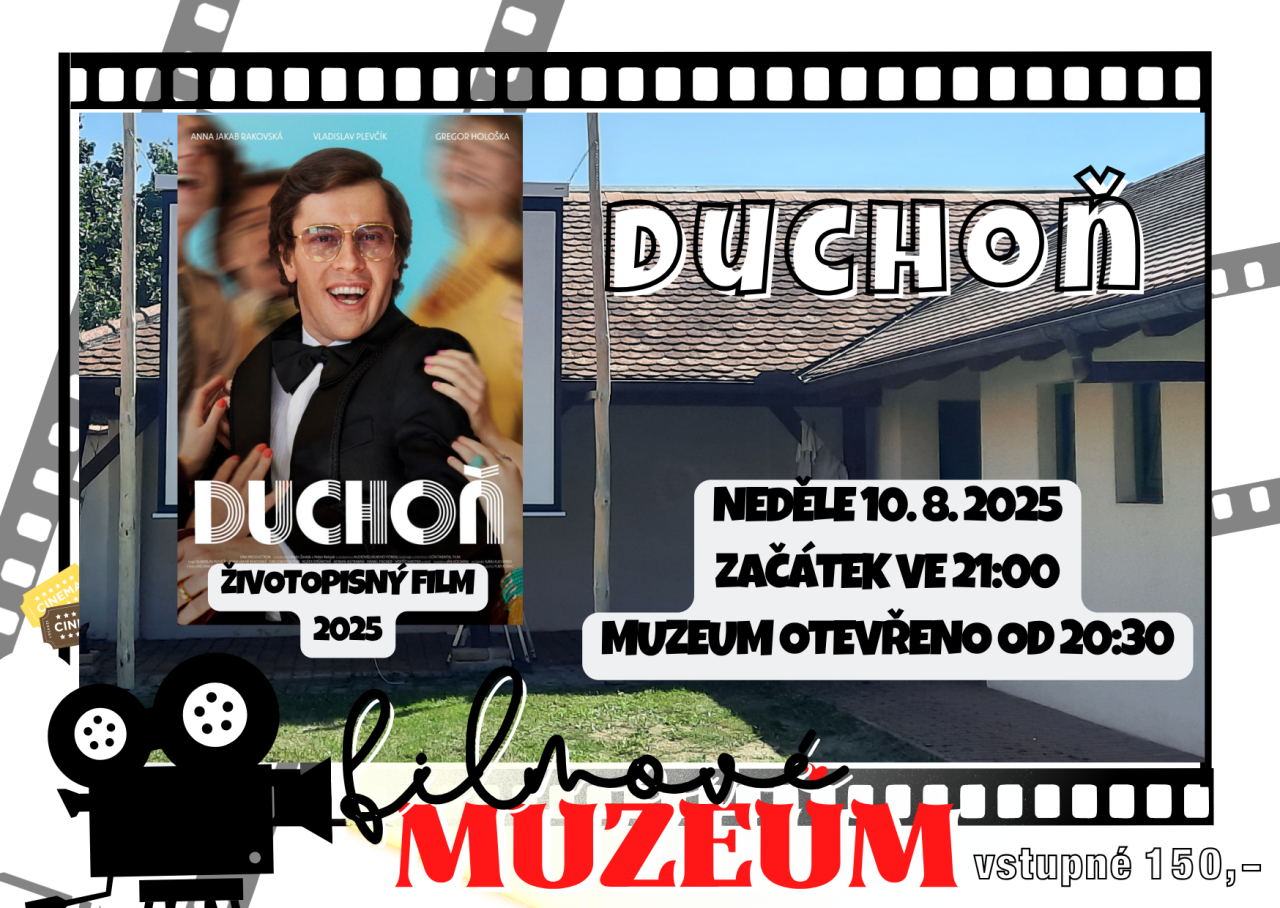 Město Lanžhot Vás srdečně zve na filmové promítání ve dvoře muzea. V neděli 10. 8. 2025 budeme promítat životopisný hudební film - DUCHOŇ.