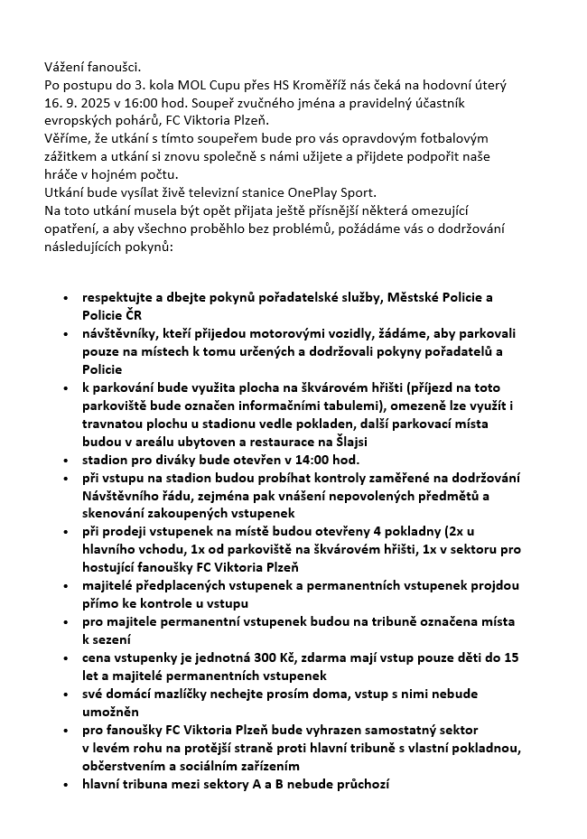 Los 3. kola MOL Cupu nám z rukou Jana Kollera přiřadil jednoho z nejatraktivnější soupeřů - účastníka letošního ročníku Evropské ligy FC Viktoria Plzeň. Utkáme se s ní hned po našich hodech, v úterý 16. září 2025 od 16 hodin na Šlajsi.