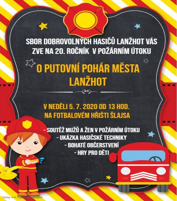 Sbor dobrovolných hasičů Lanžhot Vás zve na 20. ročník v požárním útoku O PUTOVNÍ POHÁR MĚSTA LANŽHOT v neděli 5. 7. 2020 od 13 hodin na fotbalovém hřišti Šlajsa.