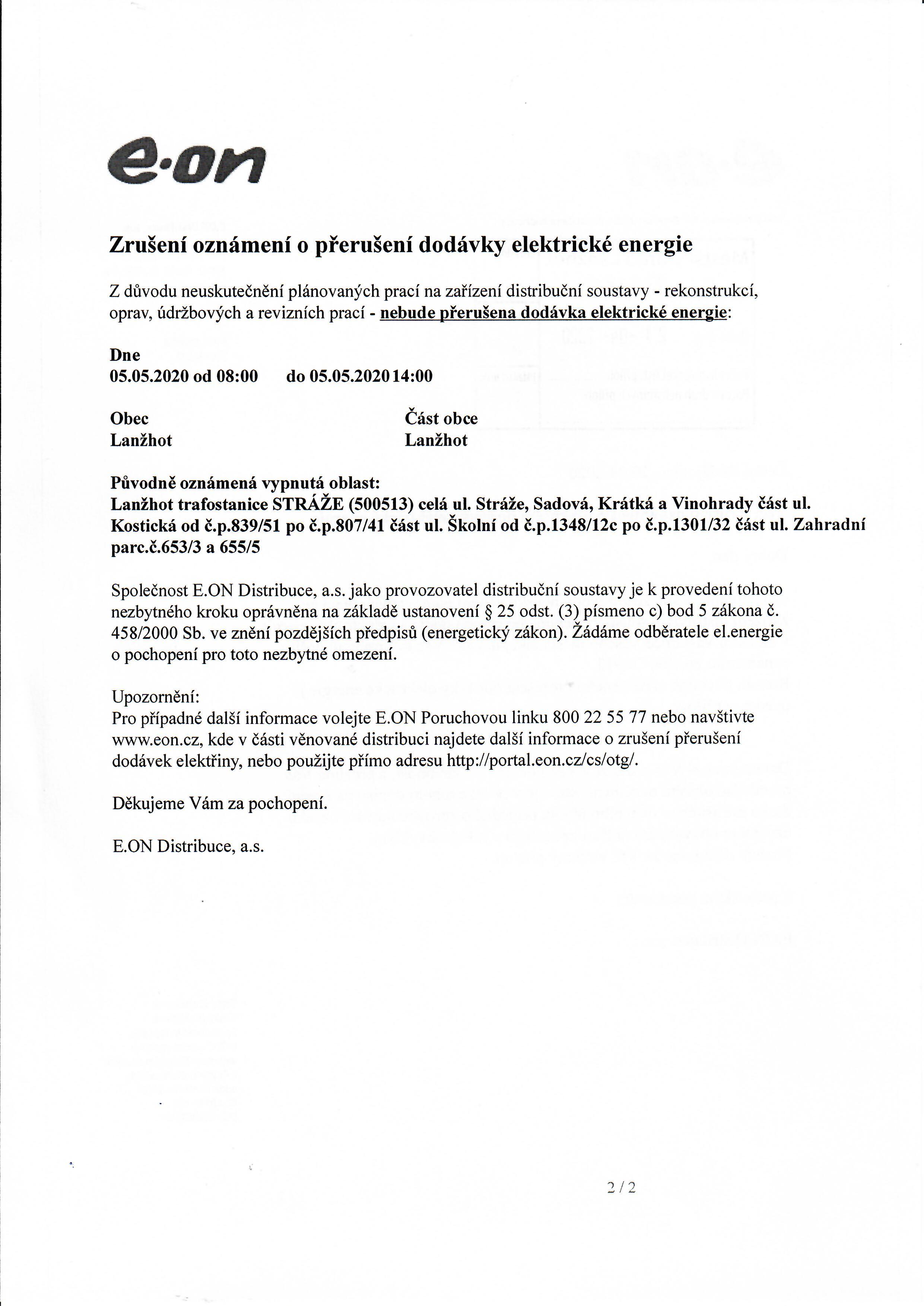 Pro případné další informace volejte E.ON Poruchovou linku 800 22 55 77 nebo navštivte www.eon-distribuce.cz, kde najdete další informace o přerušení dodávek elektřiny.