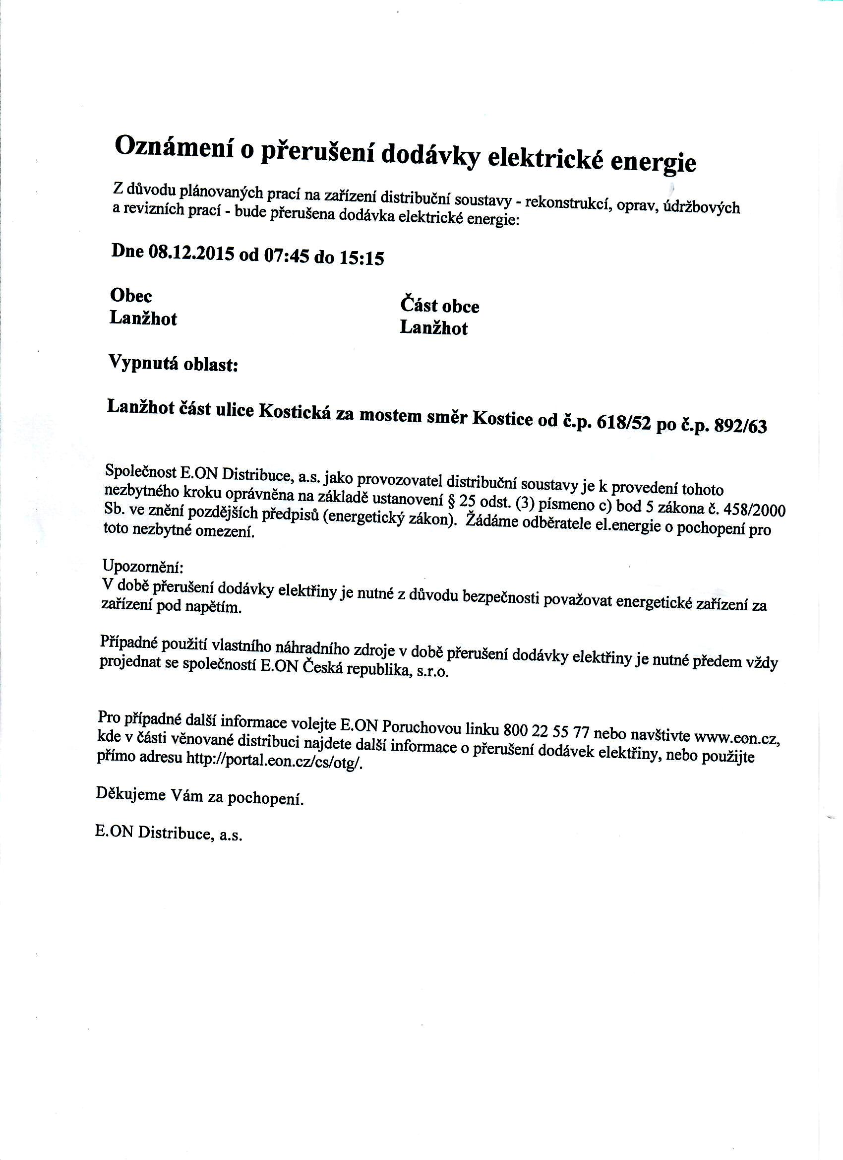 Aktuality - OZNÁMENÍ O PŘERUŠENÍ DODÁVKY ELEKTRICKÉ ENERGIE