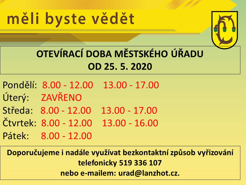 OTEVÍRACÍ DOBA MĚSTSKÉHO ÚŘADU OD 25. 5. 2020.