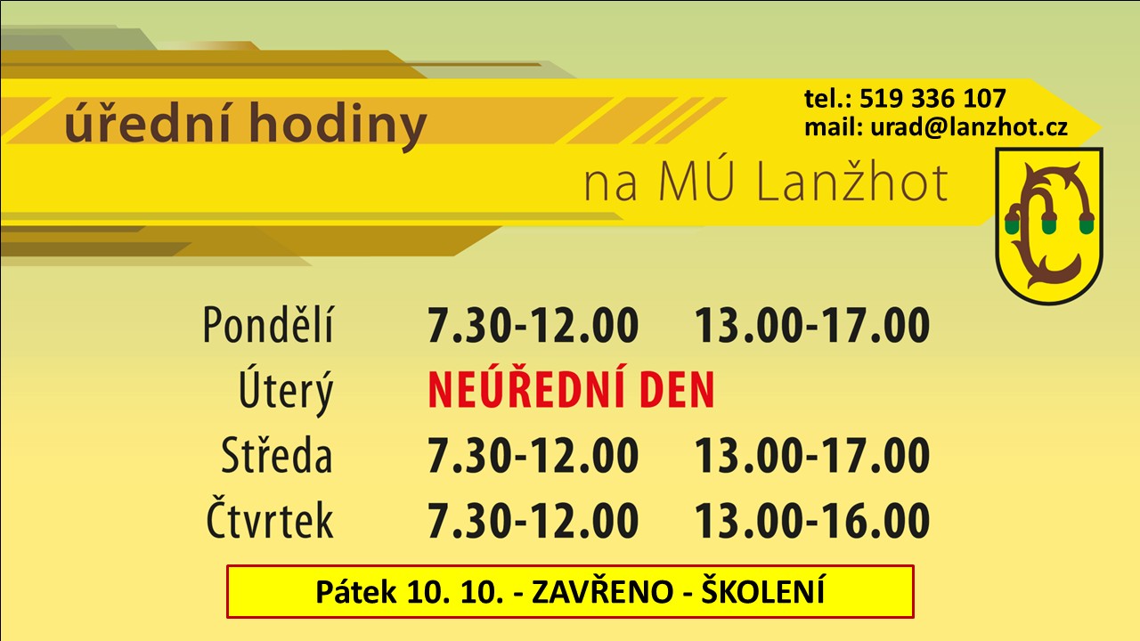 V pátek 10. 10. 2025 bude na městském úřadě ZAVŘENO - ŠKOLENÍ.