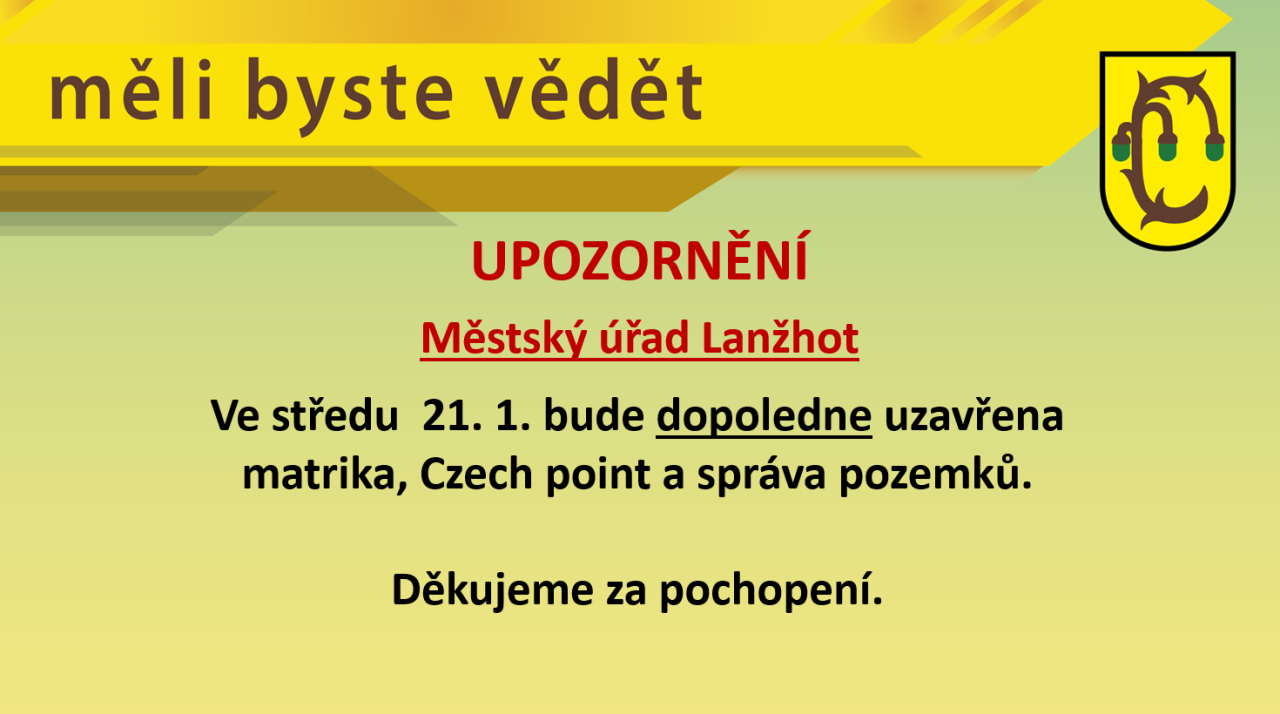 Ve středu 21. 1. bude dopoledne uzavřena matrika, Czech point a správa pozemků. Děkujeme za pochopení.