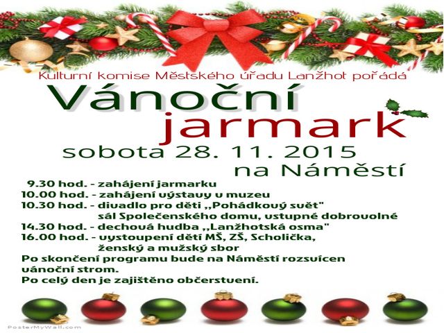 Kulturní komise Městského úřadu Lanžhot pořádá VÁNOČNÍ JARMARK KDY - sobota 28. 11. 2015 na Náměstí Zahájení jarmarku je v 9.30 hod. Všichni jste srdečně zváni.