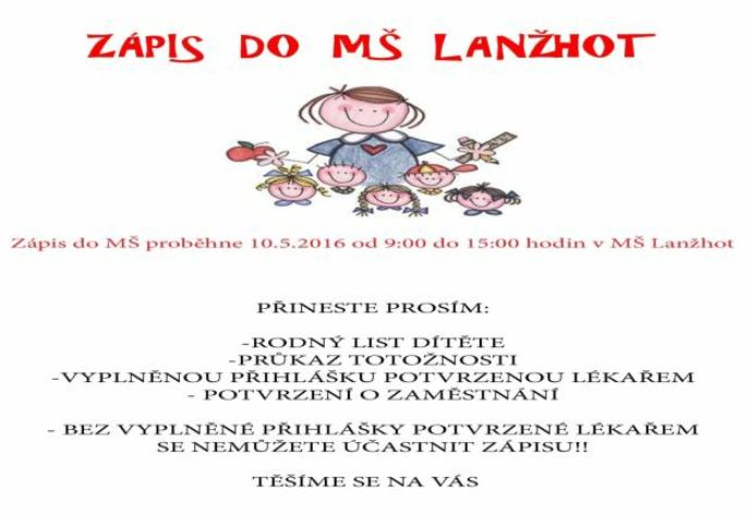Zápis do Mateřské školy Lanžhot proběhne dne 10. května 2016 od 9.00 do 15.00 hod v MŠ Lanžhot.