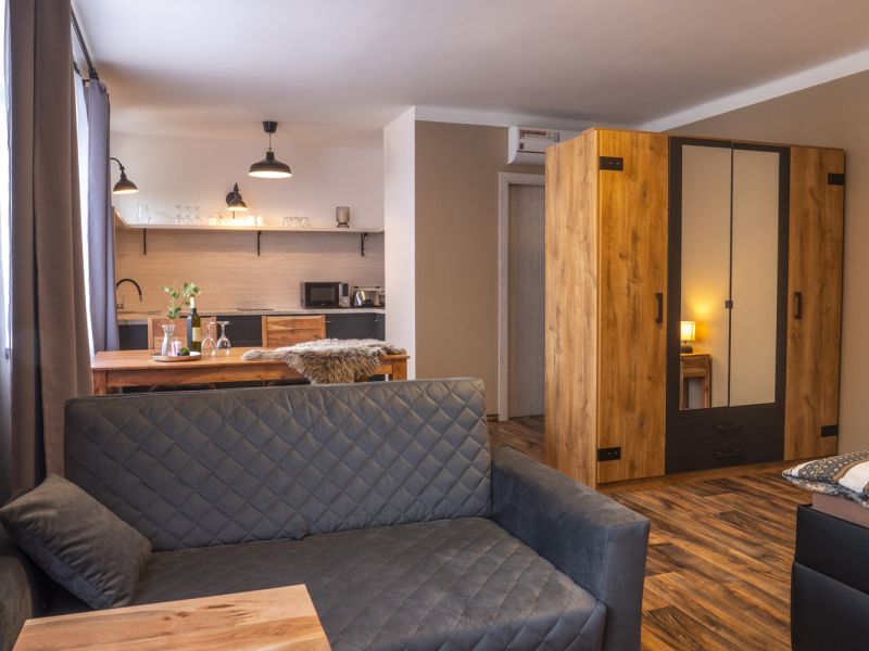 Ubytování je rozděleno na 3 apartmány s celkovou kapacitou 16 osob. Parkování pro 4 vozy na soukromém parkovišti vedle domu. Jedná se o apartmány hotelového typu s kompletním vybavením.
